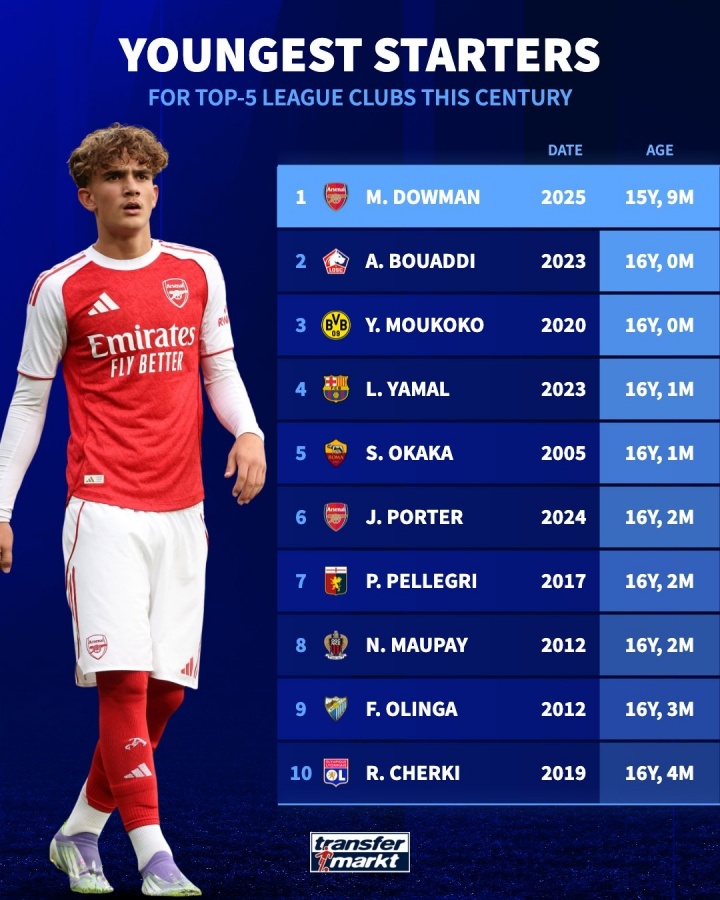 10月30日讯 据英国转会市场的统计,昨晚,马克斯·道曼代表阿森纳在英格兰联赛杯对阵布莱顿的比赛中首发,成为本世纪欧洲五大联赛俱乐部最年轻的首发球员。